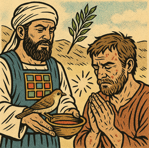 살아 있는 정결한 새 두 마리, 백향목, 홍색 실, 우슬초를 사용한 정결 예식이 진행됩니다.