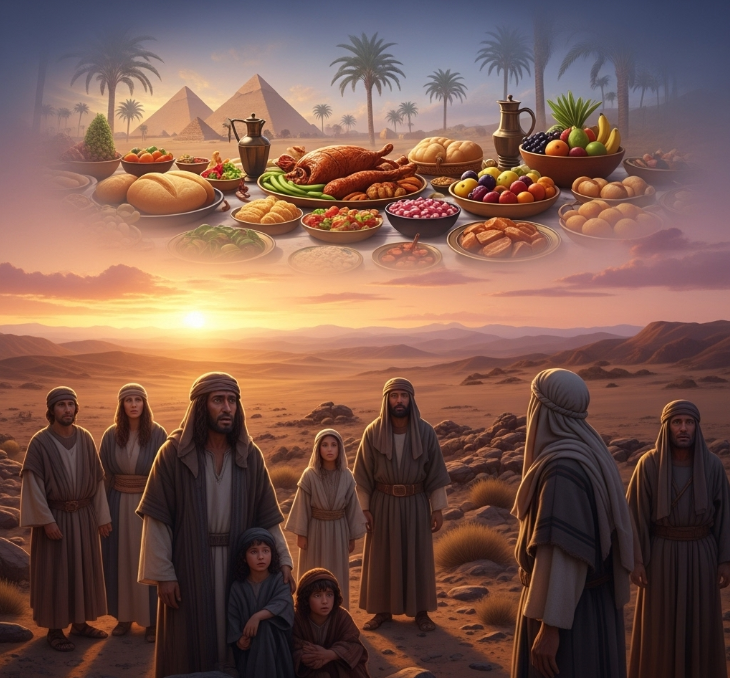 백성들은 하나님이 주신 만나에 싫증을 내고 애굽의 음식(고기, 오이, 파, 마늘 등)을 그리워합니다