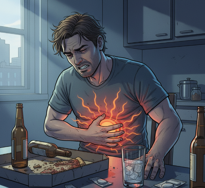 밤사이 알코올이 위 점막을 자극하고 하부식도괄약근을 느슨하게 만들면 다음날 아침 속쓰림, 명치 화끈거림, 신물이 쉽게 생깁니다.