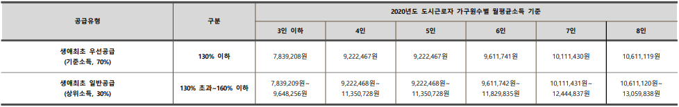 ※ 2020년도 도시근로자 가구원수별 월평균 소득 기준(2021년 2월 25일 이후 입주자 모집공고분부터 적용)