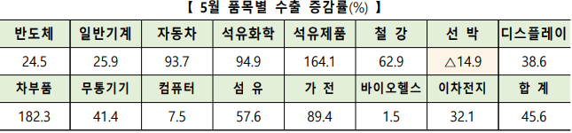 5월 수출은 전년동기대비 +45.6% 증가한 507.3억 달러