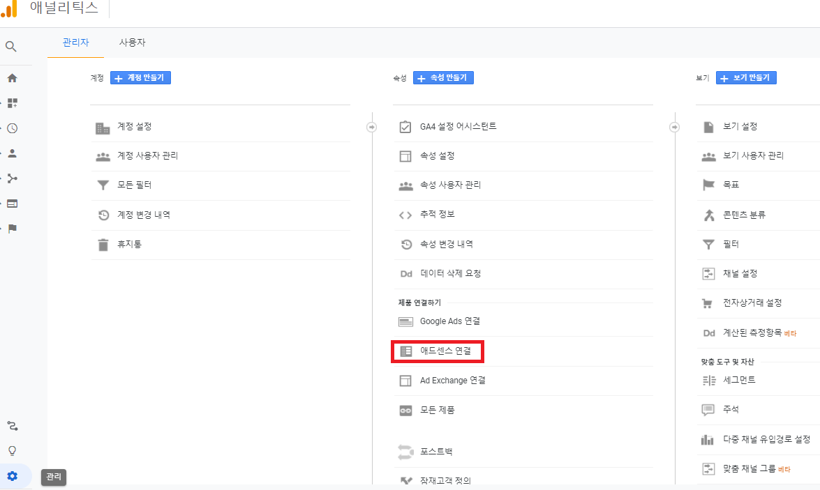 이제 애널리틱스로 돌아가서 애드센스를 연동해 줍시다.