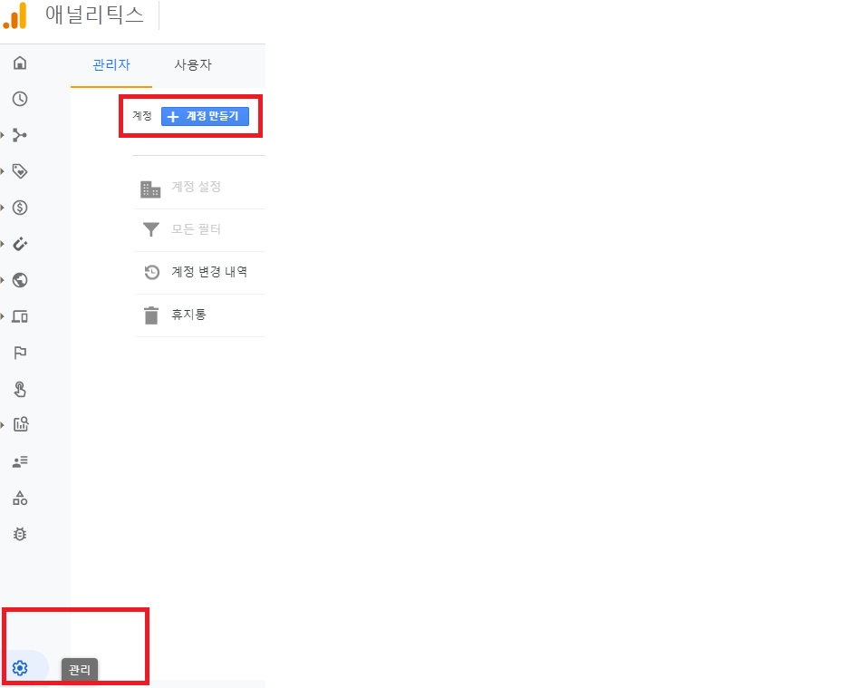 애널리틱스 홈 왼쪽 아래있는 관리를 누르신 후 계정 만들기를 진행합니다.