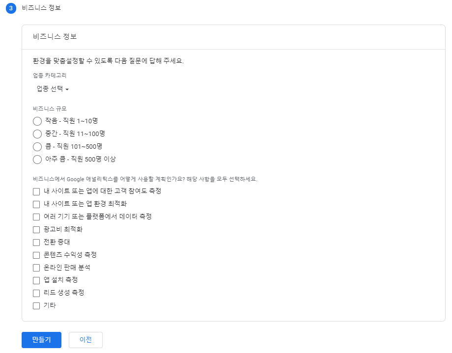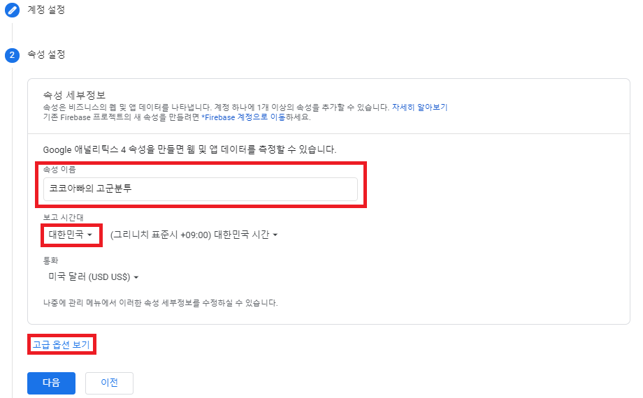 속성 이름 - 자신의 블로그 이름으로 채워넣어주시고 보고 시간대 - 대한민국으로 설정 후 밑에 고급옵션 보기를 클릭해주세요.