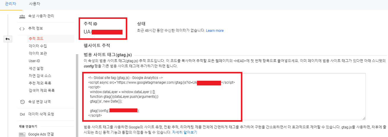 아까 애널리틱스에서 복사한 ①추적 ID를 입력해주세요.