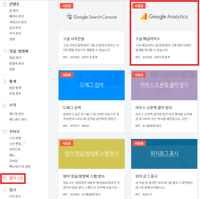 티스토리 플러그인으로 들어가셔서 애널리틱스 클릭해주세요.
