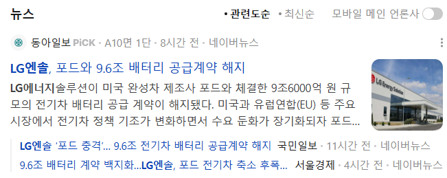 특히 오늘 하락의 직접적인 트리거로는 LG에너지솔루션의 대형 배터리 공급계약 해지 이슈가 지목되고 있습니다.