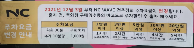 NC전주점은 매장별로 영업시간이 상이할 수 있으며, 주차요금 및 무료주차시간 역시 구매 금액에 따라 달라질 수 있습니다.