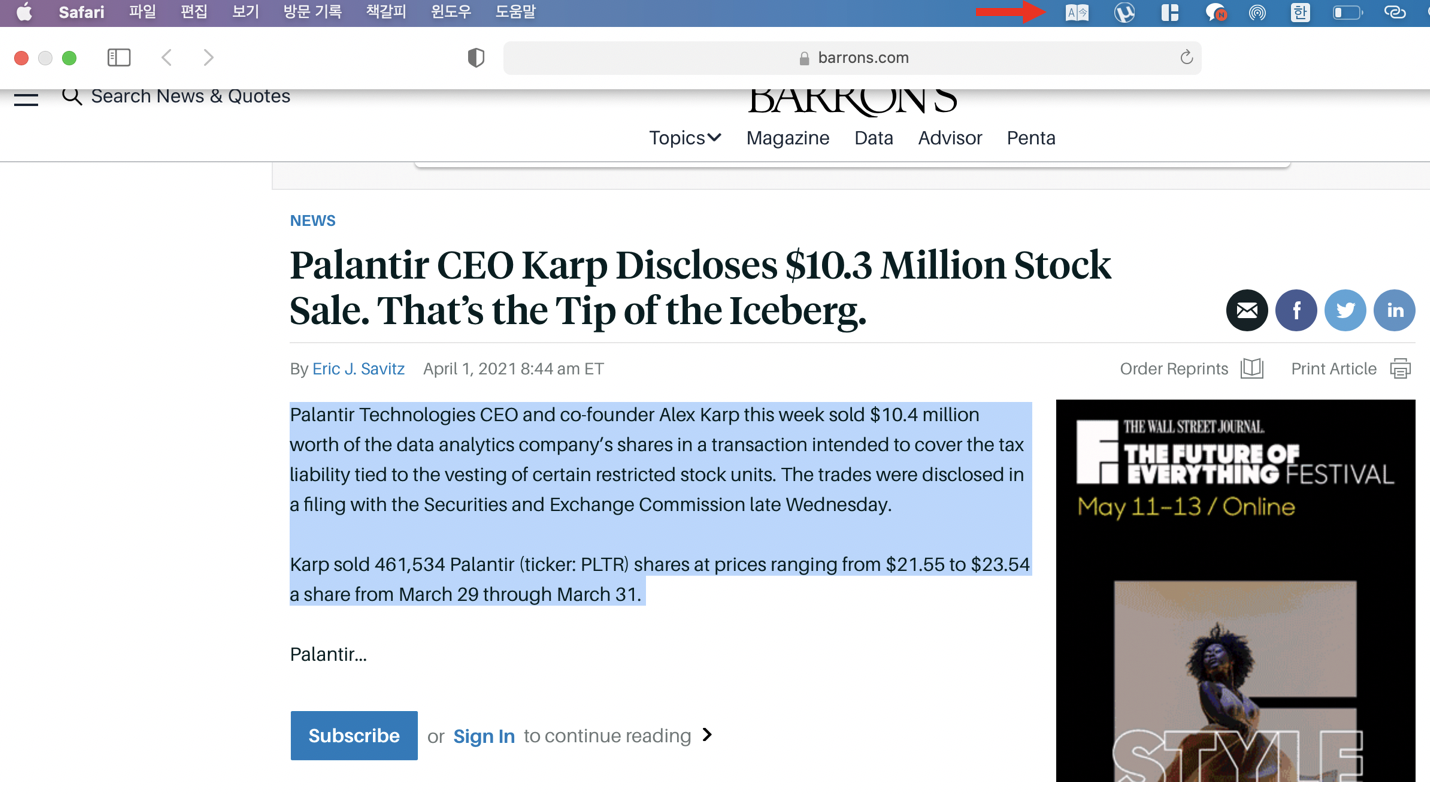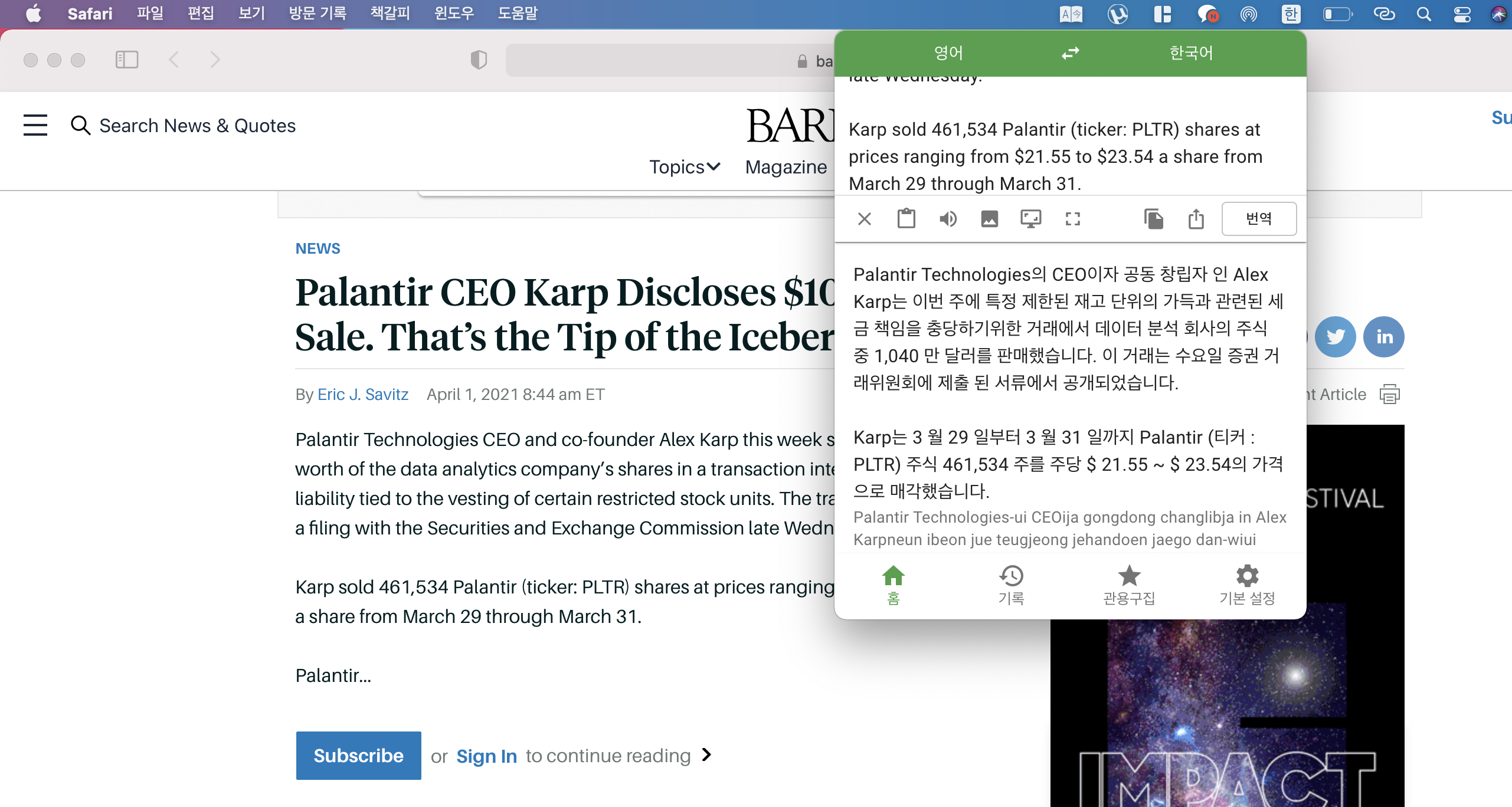 사파리 자체적으로 번역기가 안되다보니 여러 가지 방법들로 사용하시는 분들이 많이 계시지만 저는 그냥 다 불편해서 번역이 많이 필요할 때는 크롬 사용했었는데 이 방법을 사용하니까 크롬 사용하는 일이 거의 없어졌습니다.