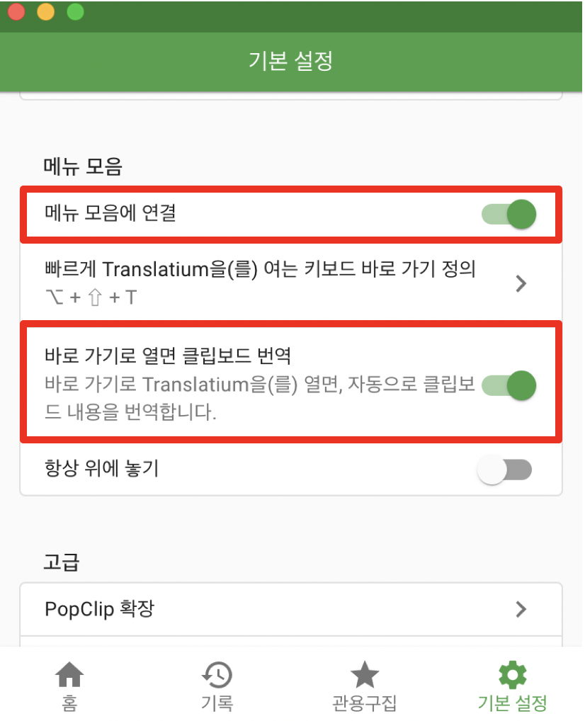 메뉴 모음에 연결, 바로 가기로 열면 클립보드 번역을 활성화시켜주세요