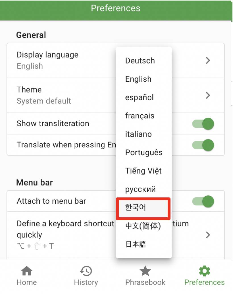 다시 Translatium에 기본 설정 들어가셔서 메뉴 모음 탭에 있는