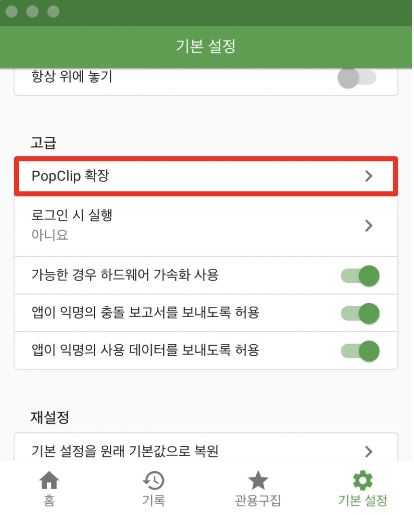 PopClip 확장을 클릭하시면 아래와 같은 창이 열립니다.