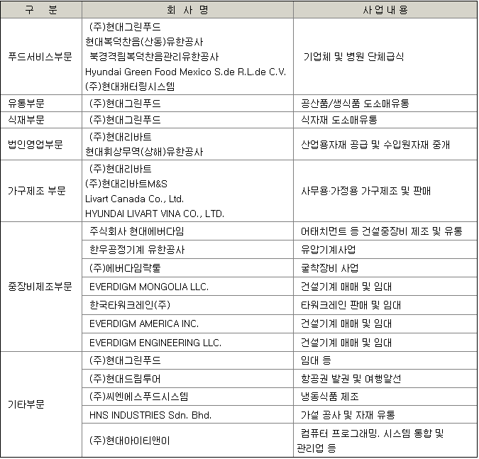 현대그린푸드 및 그 종속회사는 푸드서비스, 유통, 식재, 법인, 영업, 여행, 중장비, 가구제조, 컴퓨터 프로그래밍, 시스템 통합 및 관리사업부문 등으로 구성되어 있다.