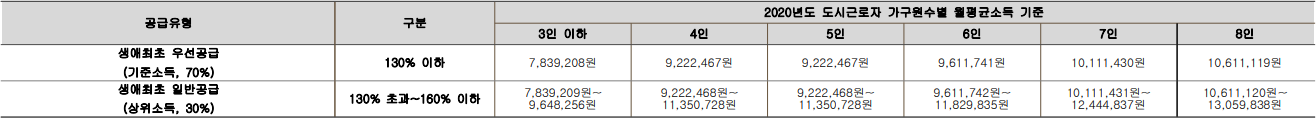 - 소득기준 : 해당 세대의 월평균 소득이 전년도 도시근론자 가구원수별 월평균소득 기준이 160% 이하인 자