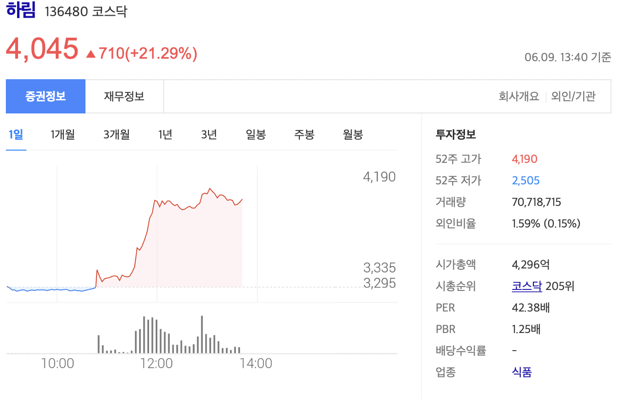 상승한 이유는 하림은 국제 해운 물류를 담당하고 있는 팬오션에 항공 물류를 더해 다양한 사업에서의 시너지를 기대하고 있다. 그렇기에 하림 그룹이 이스타항공 예비입찰에 자회사인 벌크선사 팬오션을 통해 인수의향서(LOI)를 제출했다는 보도가 나오자마자 급등하였다.