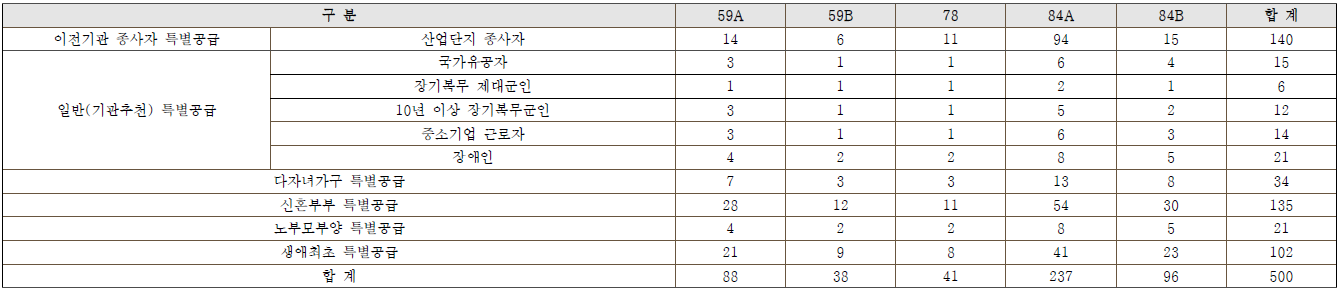 [특별공급 500세대(이전기관(산업단지)종사자 특별공급 140세대, 일반[기관추천]특별공급 68세대, 다자녀가구특별공급 34세대, 신혼부부특별공급 135세대, 노부모부양특별공급 21세대, 생애최초 주택구입 특별공급 102세대 포함)] 및 부대복리시설