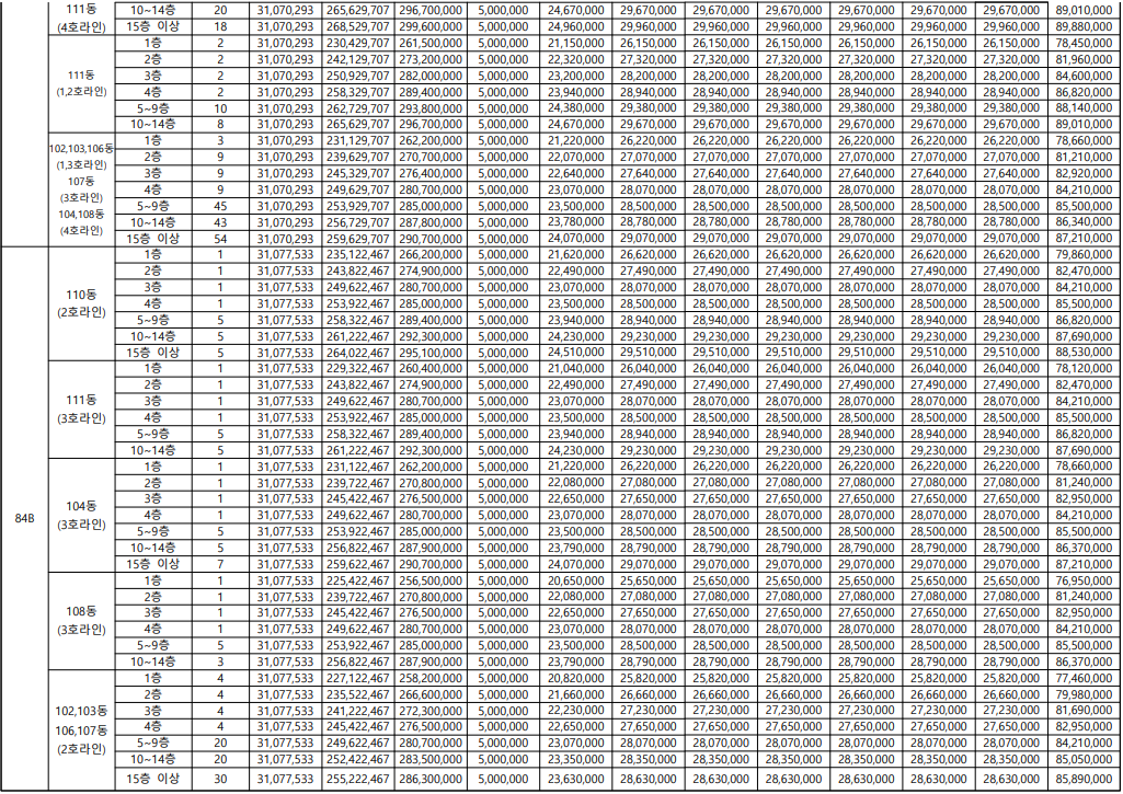 84B 타입 : 2억 5,650만 원 ~ 2억 9,510만 원
