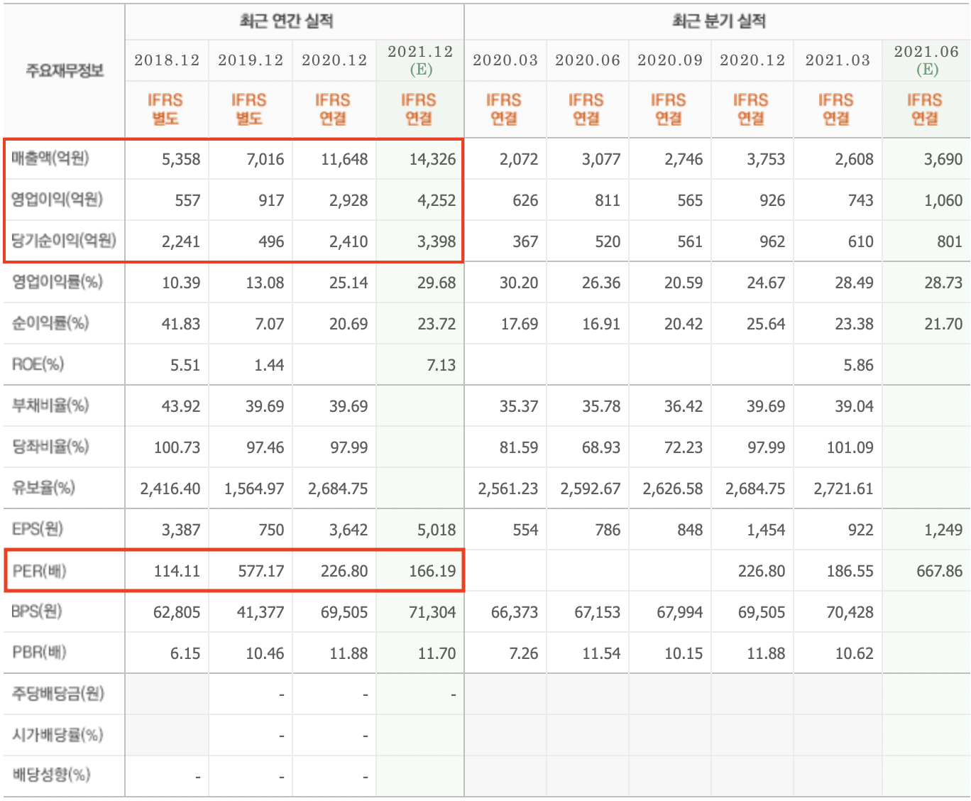 그에 맞게 주가도 높아져 PER가 눈에 띄게 줄어들고 있진 않지만..