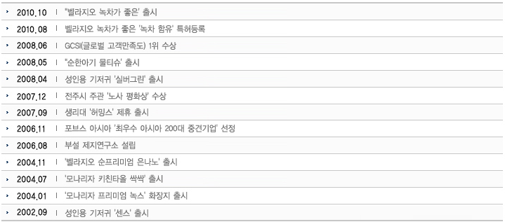 또한 화장지 전문 생산업체로서 깨끗하고 엄성된 원료와 최고의 기술력으로 위생용품은 물론 고객의 삶의 질을 향상시키고 편리함을 제공하기 위해 생활용품 개발에도 노력을 해오고 있다.