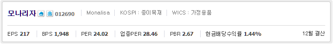 모나리자는 화장지 제조와 판매 등을 영위할 목적으로 1977년 10월 28일에 설립되어 1988년 10월 상장되어 유가증권시장에서 매매가 개시됨.