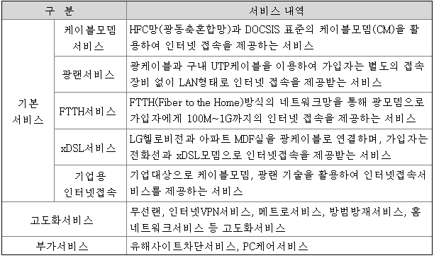 현재 초고속인터넷 서비스와 함께 인터넷전화 및 방송서비스를 결합한 TPS(Triple Play Service) 서비스 및 유해사이트 차단, PC/스마트폰 원격 점검 등과 같은 부가서비스를 제공하고 있다. 또한 기존 유선 결합 상품에 헬로모바일(MVNO) 이동통신 서비스를 접목한 QPS(Quadruple Play Service) 서비스를 제공하고 있으며, 주요 이동통신사(MNO)와 동등결합 제휴를 통해 타사의 모바일 가입자도 동등한 유무선 결합할인을 받을 수 있는 제휴 결합 서비스를 확대하여 고객의 이용 편의와 혜택을 강화하고 있다.