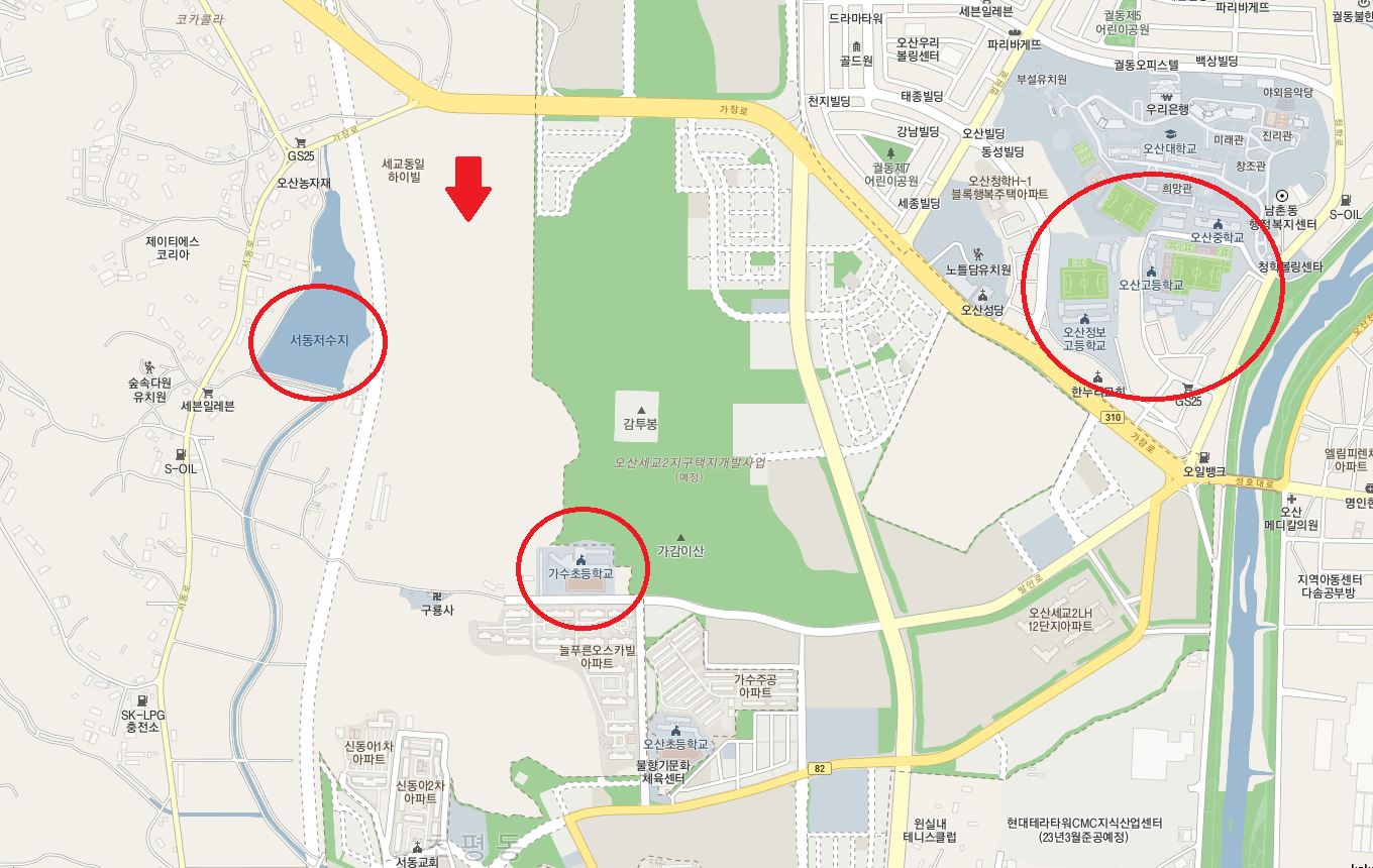 근처에 감두봉산이나 공원, 서동저수지 등이 있어서 친환경 적이지만 현재로서는 가수초, 오산중학교로 배정받을 것 같은데 도보로 가기에 살짝 멀어 보입니다.