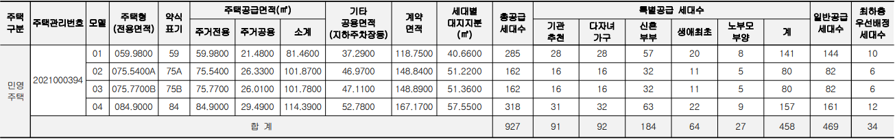 [특별공급 458세대(기관추천 특별공급 91세대, 다자녀가구 특별공급 92세대, 신혼부부 특별공급 184세대, 생애최초 특별공급 64세대, 노부모부양 특별공급 27세대 포함)]