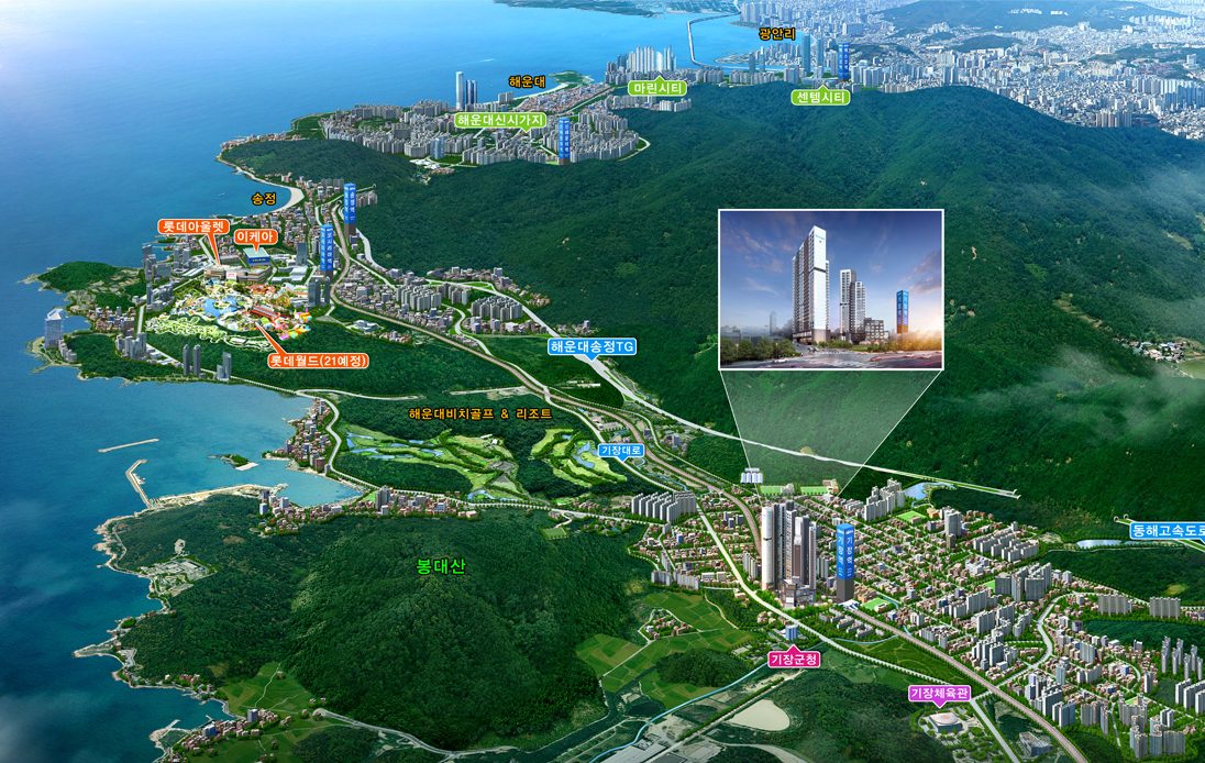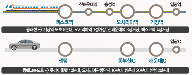 - 센텀 20분대, 기장역 도보 5분대, 벡스코역 4 정거장, 동해고속도로 등