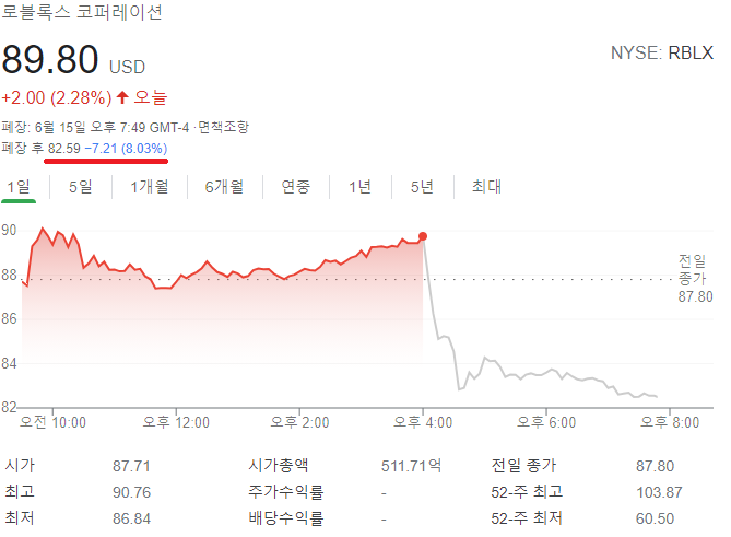 나의 최애 기업 로블록스(RBLX)가 하락하고 있다.