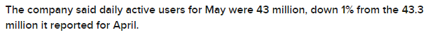 "Daily active users(DAU) were 43.0 million, up 28% from May of last year and down 1% from 43.3 million in April 2021."