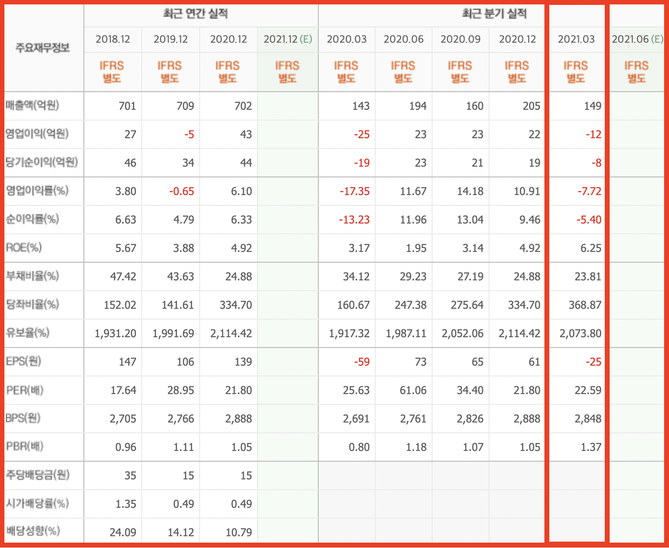 21년 1분기 영업이익과 순이익이 적자를 기록하기는 했지만 전년도 1분기랑 비교해보면 많이 개선된 것을 확인 할 수 있다.