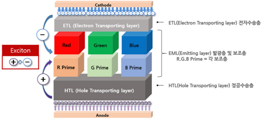 Prime(R/G/B) : 발광층에 도달한 전자를 발광층에 가두고, HTL에서 전달되는 정공을 발광층에 효과적으로 주입하는 재료