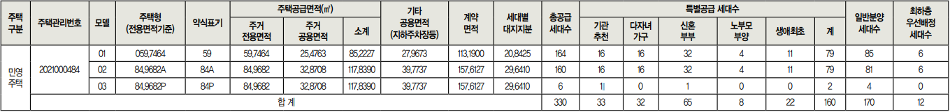 [특별공급 160세대(일반[기관추천] 33세대, 다자녀가구 32세대, 신혼부부 65세대, 노부모부양 8세대, 생애최초 22세대 포함)] 및 부대복리시설
