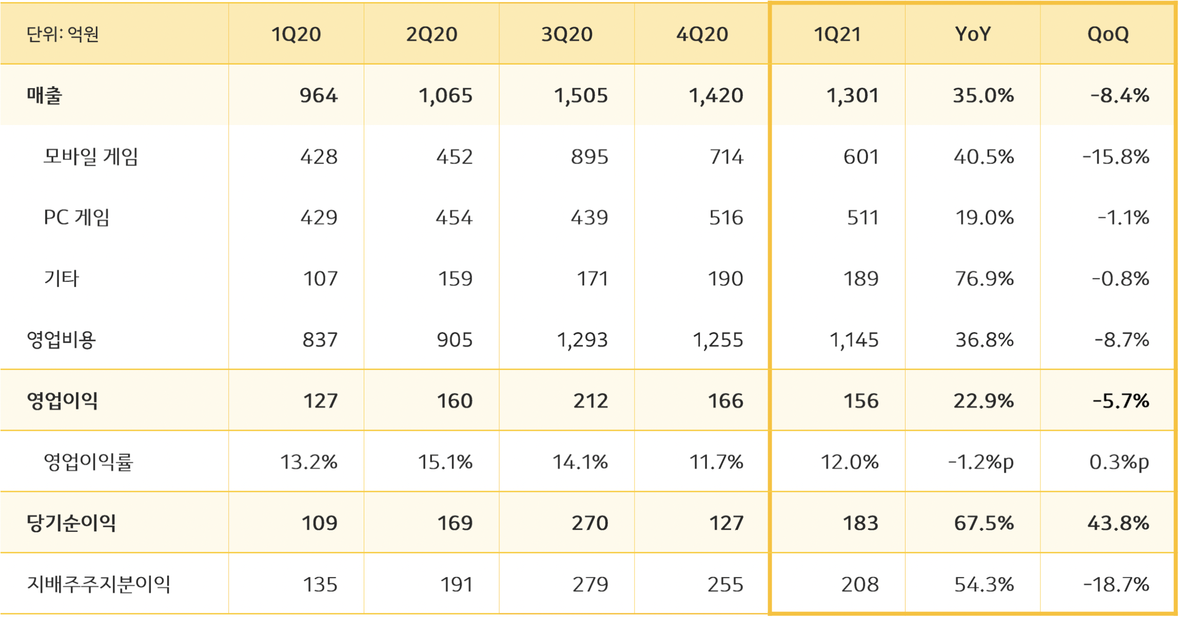 3. 21년 1분기 매출액 : 1,301억(+34.9% YoY)