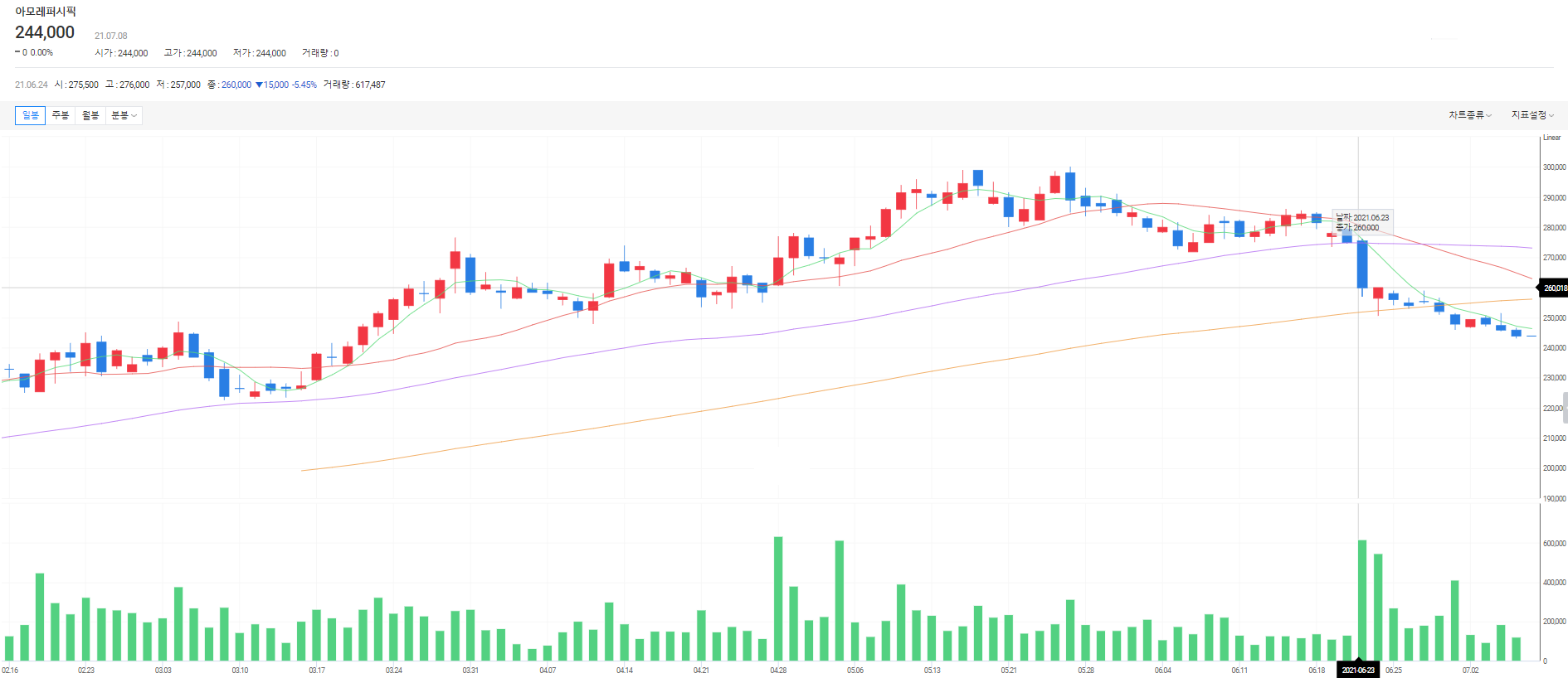 아모레퍼시픽 주가가 6월 23일 거래량과 함께 큰 음봉이 나오면서 하락추세로 전환되었다.