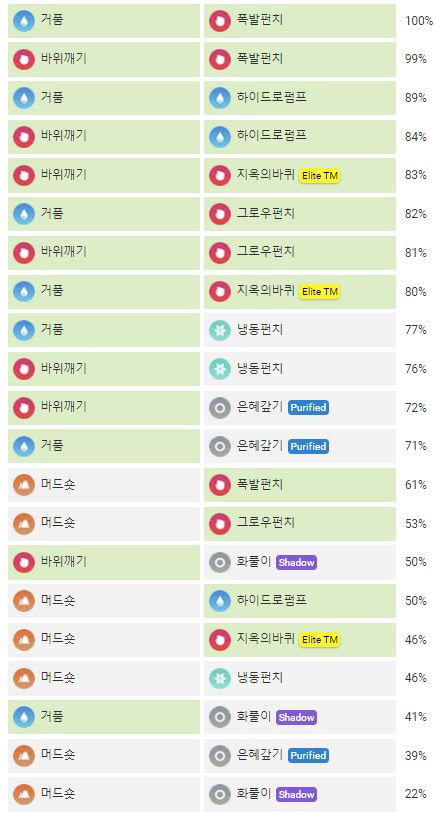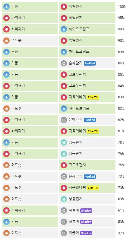2020년 고 배틀리그 시즌1이 진행중인 4월 하이퍼리그의 신흥적폐로 떠올랐다. 채용하는 기술ㅇ은 노말이 머드숏. 스페셜이 폭발펀치와 냉동펀치다. 머드숏의 괴랄한 차징속도와 얼음/격투가 저격하는 상성 수에 맞물려 자속보정을 받지 못함에도 선봉이나 교체요원으로 매우 강력한 모습을 보여주고 있다. 방어 상성으로 보면 풀, 비행, 전기, 에스퍼, 페어리로 5개나 되지만 에스퍼와 페어리를 제외하면 모두 강챙이의 기술에 역으로 당할 수 있고, 에스퍼는 에브이, 가디안 등 유리대포형이 대부분이며, 페어리는 하이퍼리그 대표 강캐인 토게키스가 비행 타입도 있어서 조심해야 한다. 덕분에 사이코브레이크를 획득한 아머드 뮤츠가 강챙이의 카운터로 급부상했다.