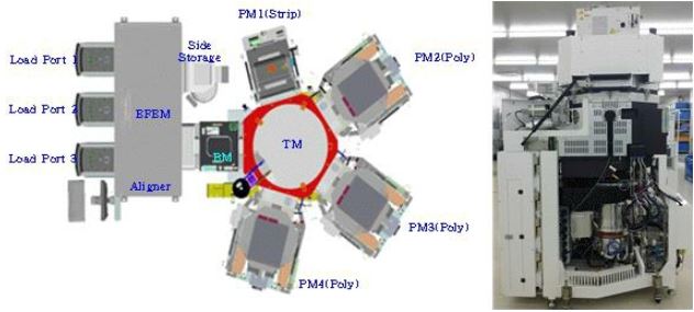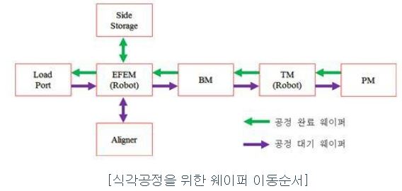 당사의 300mm Poly 식각 장비는 위 그림과 같이 Load Port와 ETEM(Equipment Front End Moudle), BM(Buffer Module), TM(Transfer Moudule) 및 PM(Process Module)으로 구성되어 있다. 공정이 진행되는 순서는 아래와 같다.