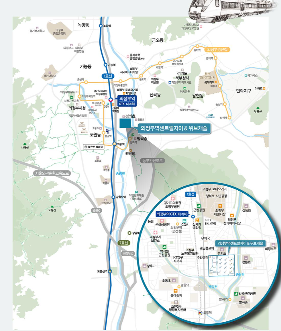 - 지하철 1호선·의정부 경전철 의정부역, 회룡역, GTX 의정부역(계획) 이용 편리