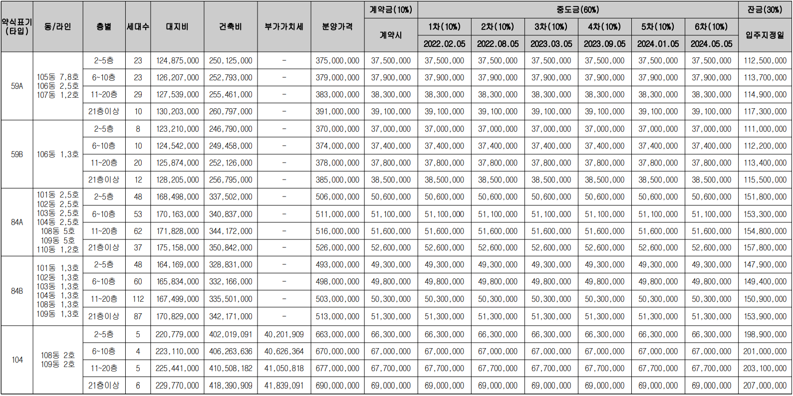 분양타입 : 59㎡(135세대) / 84㎡(507세대) / 104㎡(20세대)