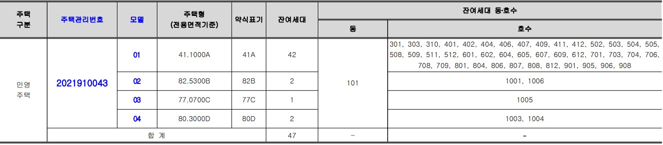 공급규모 : 아파트 지하 2층, 지상 3층 ~ 10층 1개 동 총 90세대 정당계약 및 예비입주자 계약 이후 잔여물량 47세대