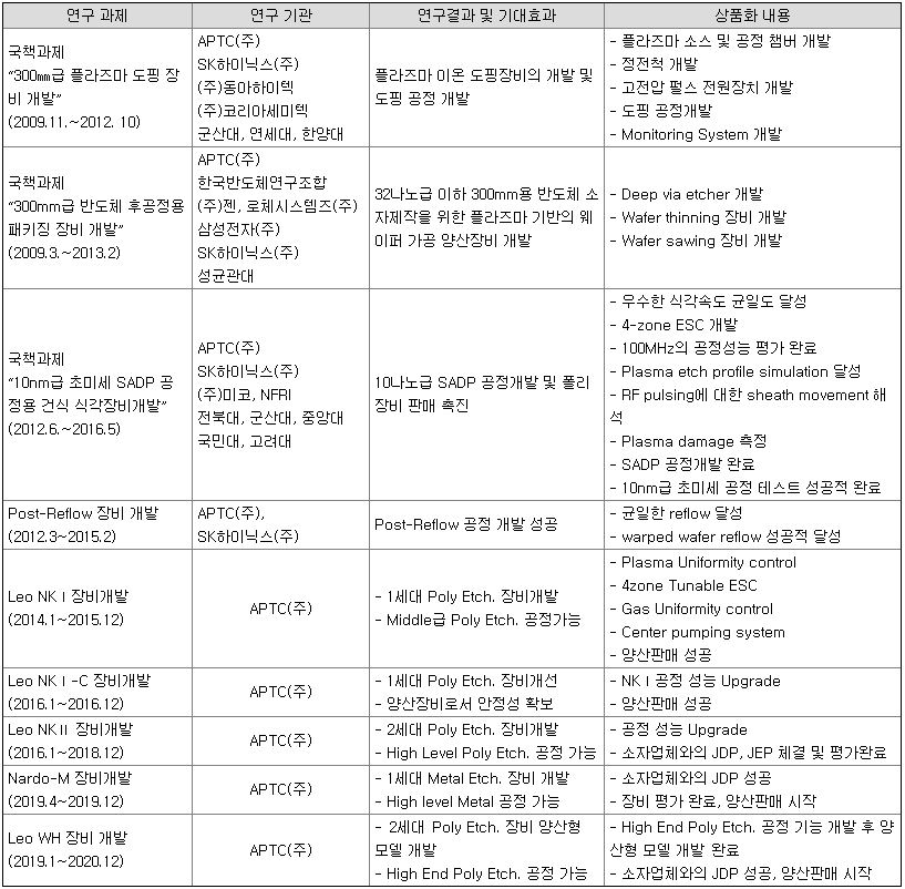 에이피티씨는 반도체 제조 전공정 장비인 건식 식각장비(Dry Etcher) 제조업체로서 관련한 원천기술을 다수 보유하고 있다. 특히 당사가 보유하고 있는 플라즈마 소스는 현재 200mm와 300mm 웨이퍼용 반도체 건식 식각장비의 원천기술로 적용되어 선응 및 가격 경쟁력을 보여주며 외산장비를 대처하고 있다. 또한 본 원천기술은 반도체 제조공정인 화학기상증착(Chemical Vapor Deposition, CVD) 장비, 원자층 박막증착(Atomic Layer Deposition, ALD) 장비, 원자층식각(Atomic Layer Etch, ALE) 장비 등 다양한 플라즈마 공정장비에 적용될 수 있다.