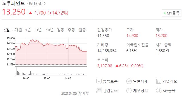 노루페인트(090350) 주가 13,250원(+14.72%)