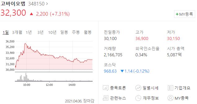 고바이오랩(348150) 주가 32,300원(+7.31%)