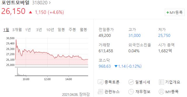 포인트모바일(318020) 주가 26,150원(+4.6%)