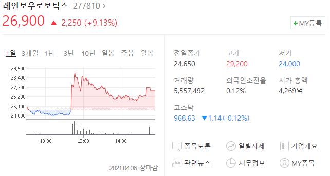레인보우로보틱스(277810) 주가 26,900원(+9.13%)