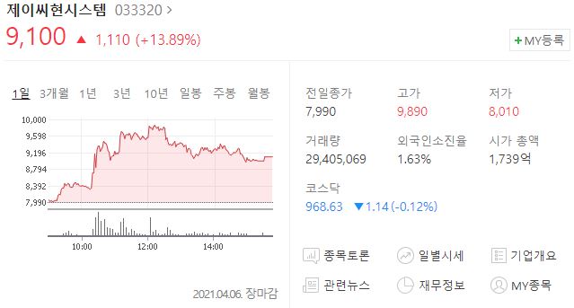 제이씨현시스템(033320) 주가 9,100원(+13.89%)