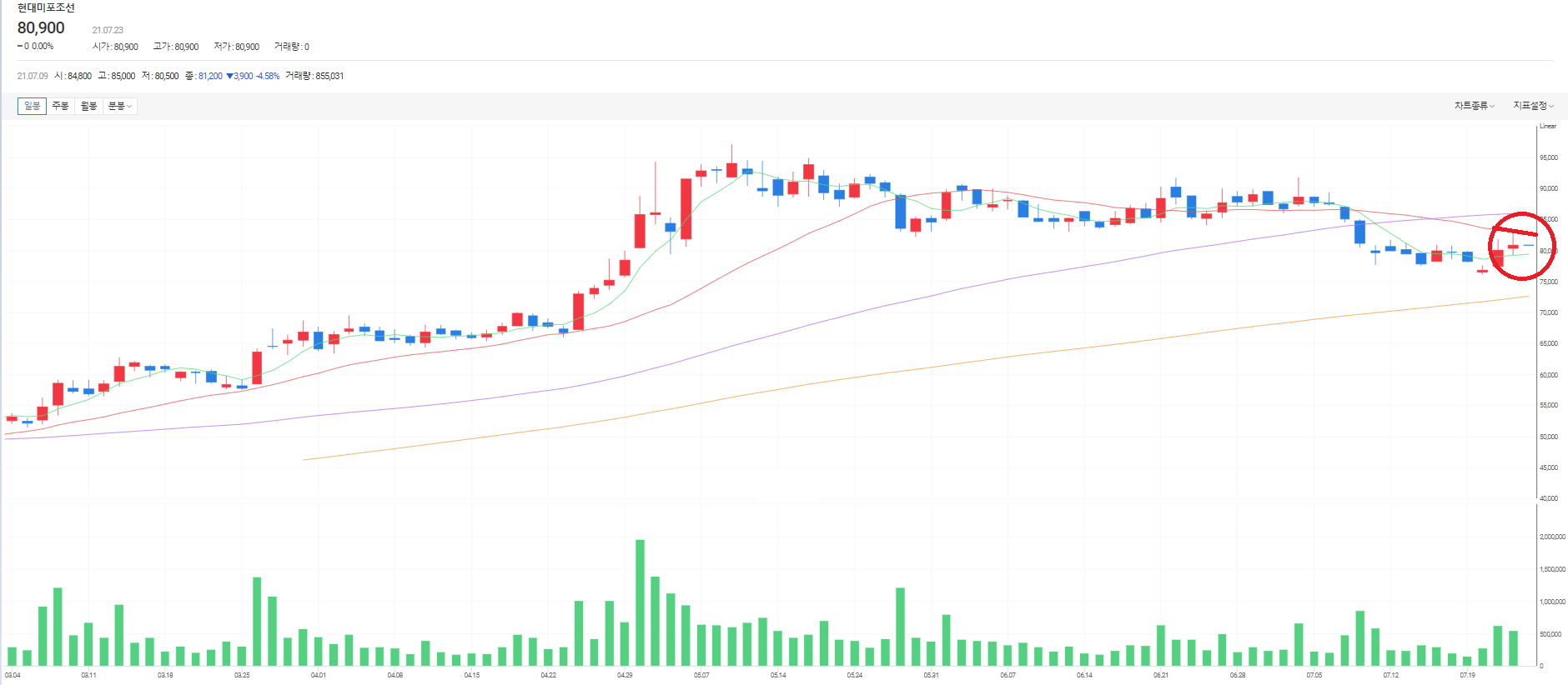 20일 선을 돌파해서 골든크로스가 일어나며 상승추세로 전환 가능할 것인지, 아님 돌파하지 못하고 다시 하락 추세로 진행될 것인지 지켜봐야겠다.