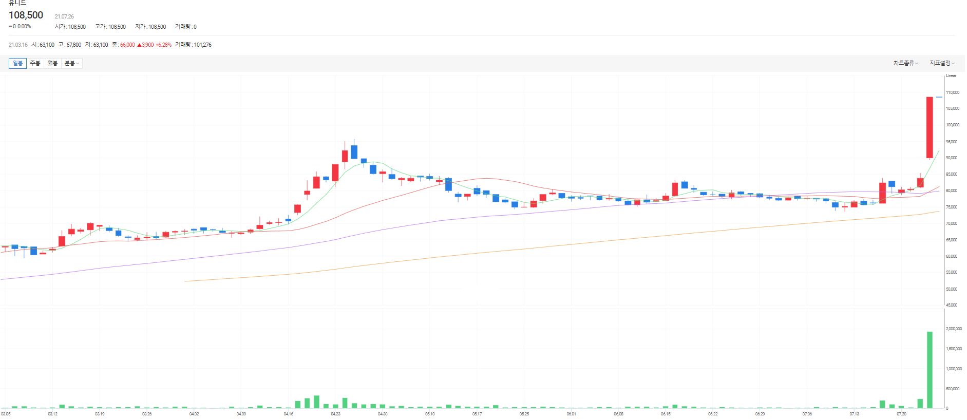폭발적인 거래량과 함께 상한가를 만들어 주었다.