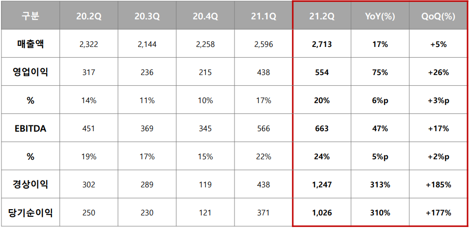 3. 21년 2분기 매출액 : 2,713억