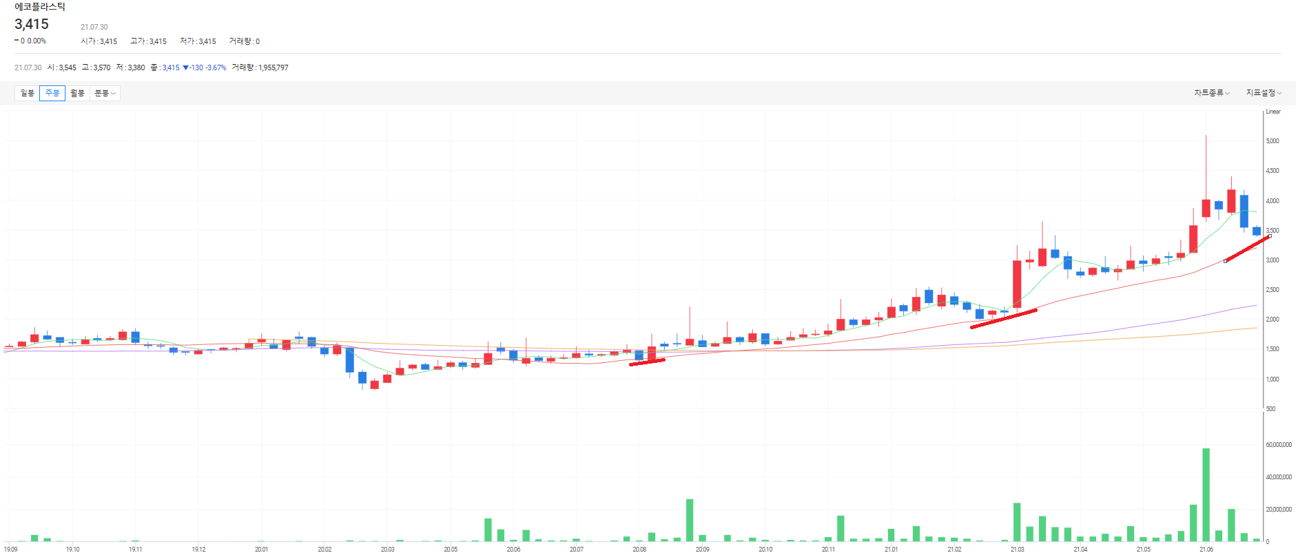 주가가 흐지부지해 보여도 일봉상 60일 이평선, 주봉상 20일 이평선을 타고 꾸준히 우상향 중이다.